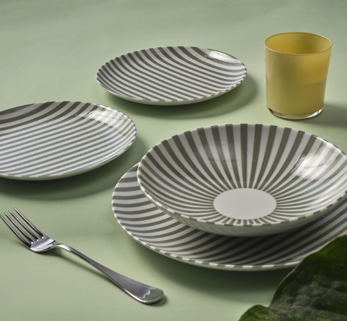 Das weiße Porzellan des Services Pastello Salvia wird durch zarte grüne Linien verziert, die den Blick auf sich ziehen.