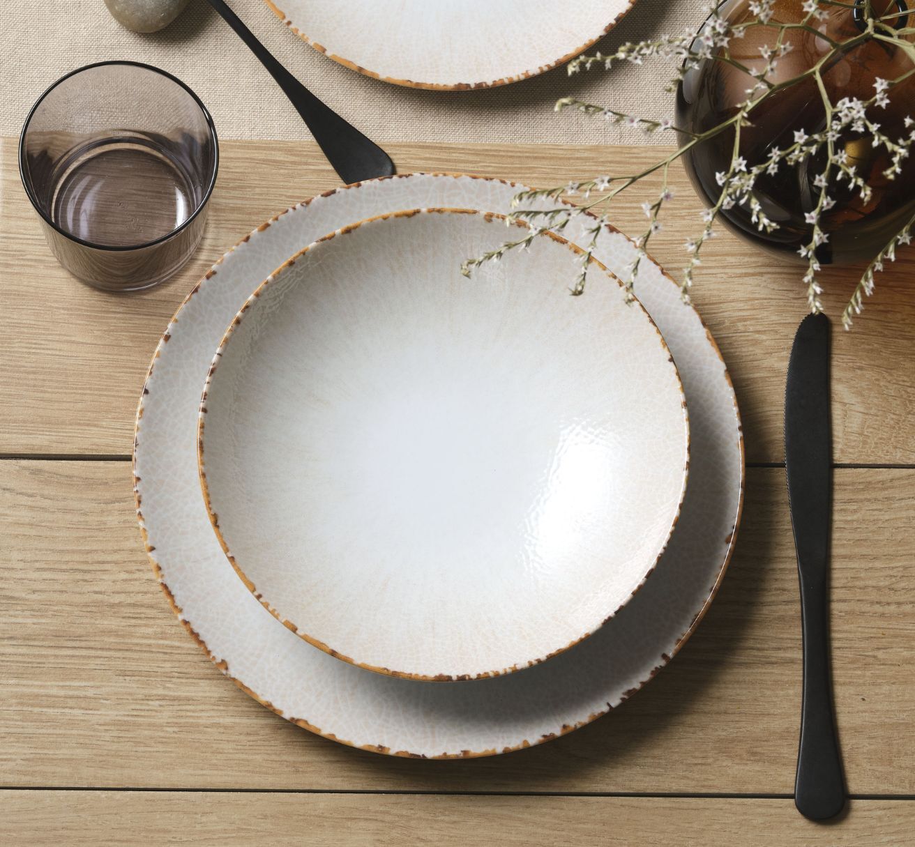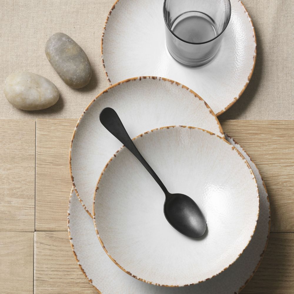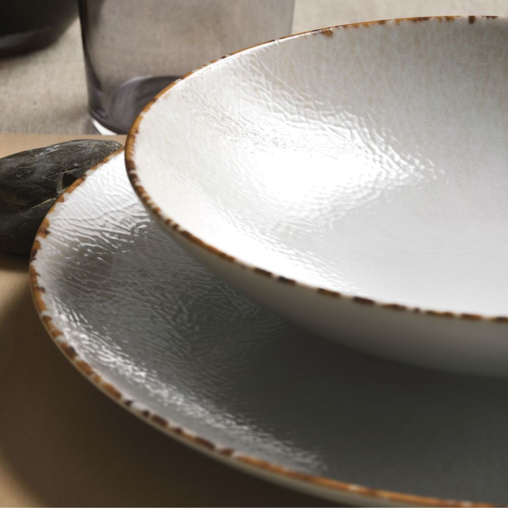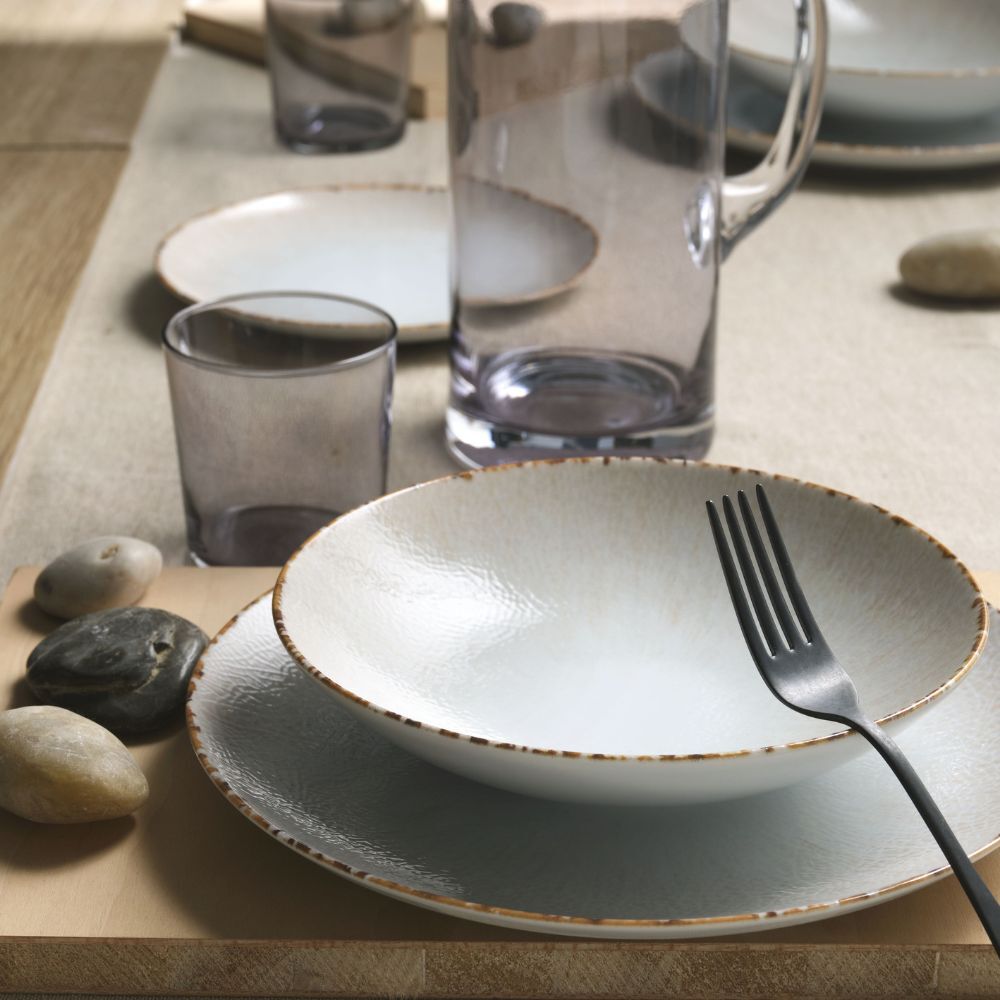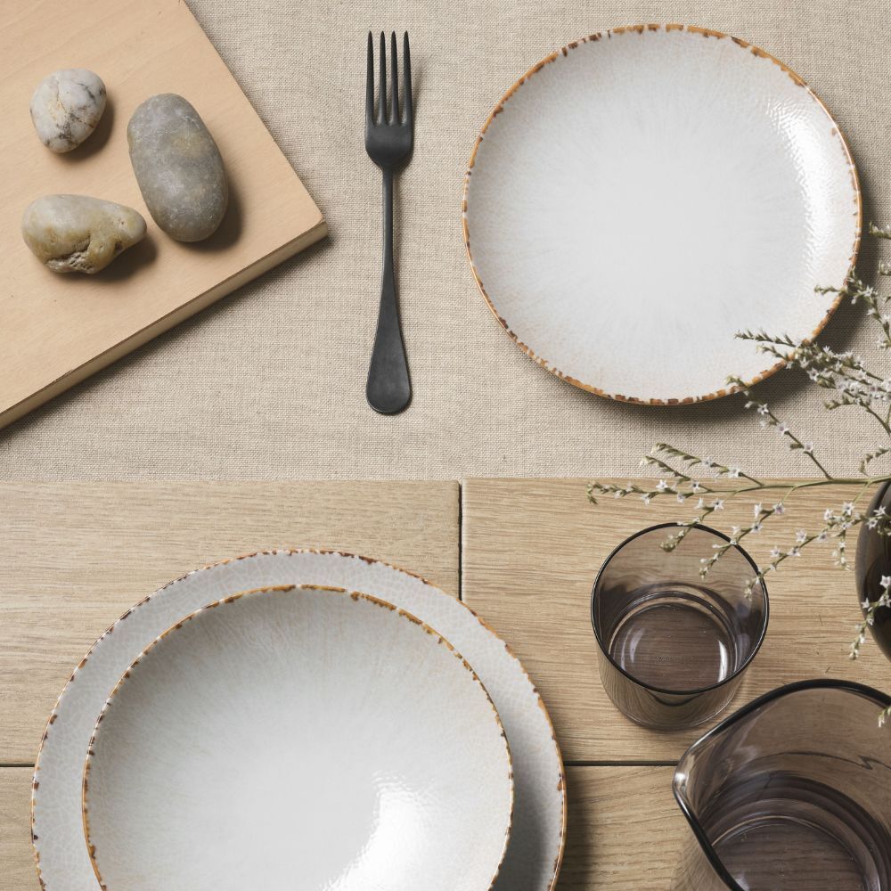 Schauen Sie sich die Struktur genau an und decken Sie den Tisch für ein Abendessen im Vintage-Stil, das dennoch zeitgemäß ist. Der kontrastierende Rand, der sich um die Teller und Pizzateller zieht, sorgt für Wärme und Harmonie, während die leichten Farbnuancen einen angenehmen Antik-Effekt erzeugen.