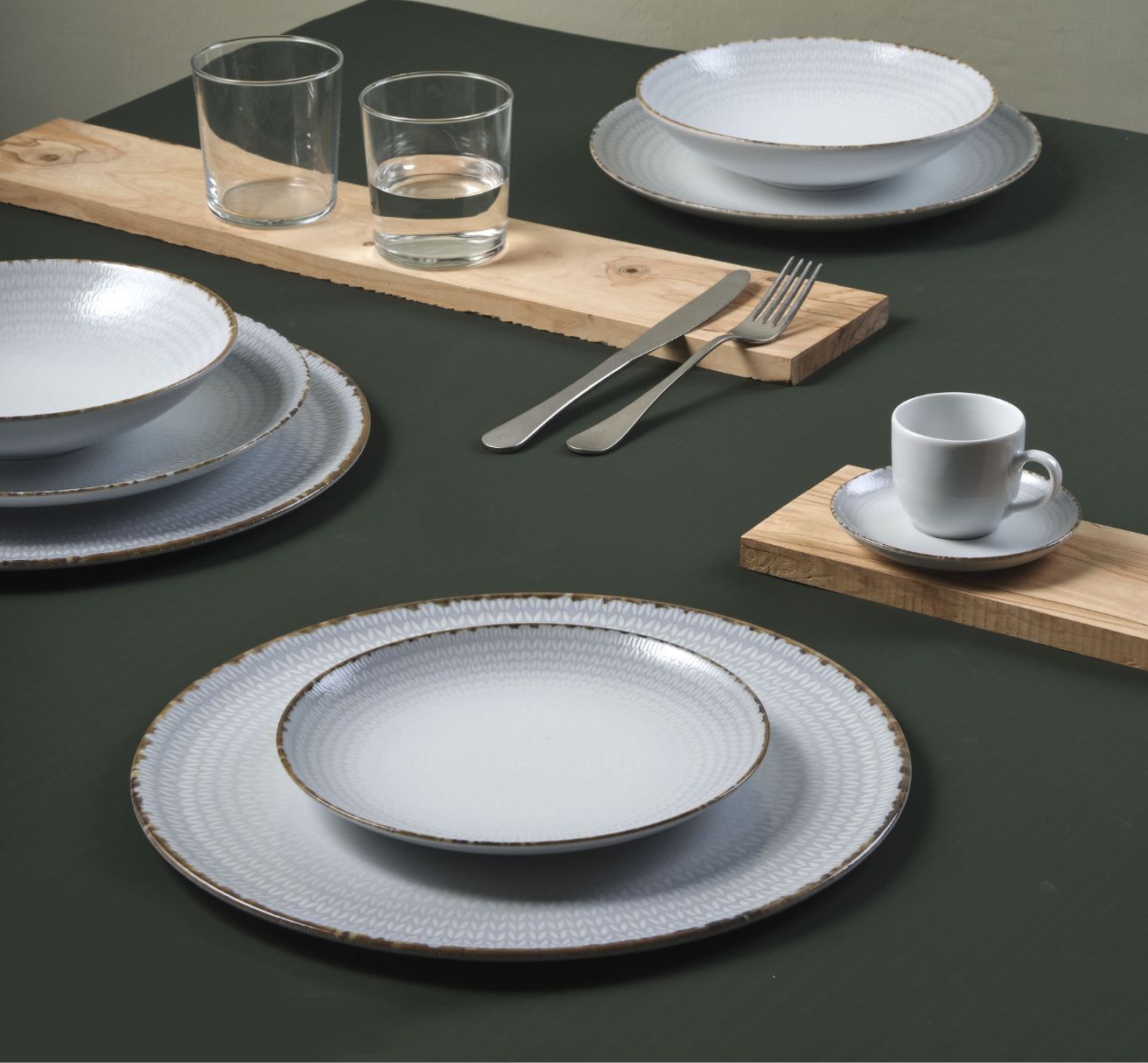 Das Dekor des Porzellanservices Tricot erinnert an Strickmuster und ziert Teller, Pizzateller und Untertassen für Kaffeetassen und Frühstückstassen. Eine dezente und raffinierte Farbnuance für den gedeckten Tisch im Frühling und Sommer.
