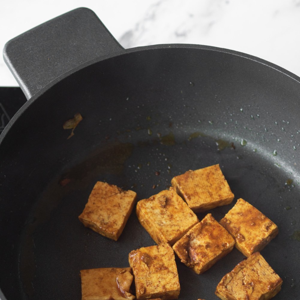 Nel frattempo, fai marinare il tofu tagliato a cubetti con spezie e salsa di soia.