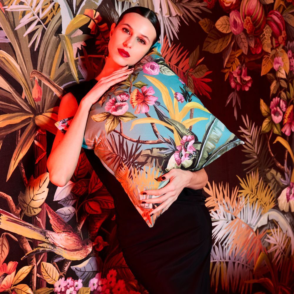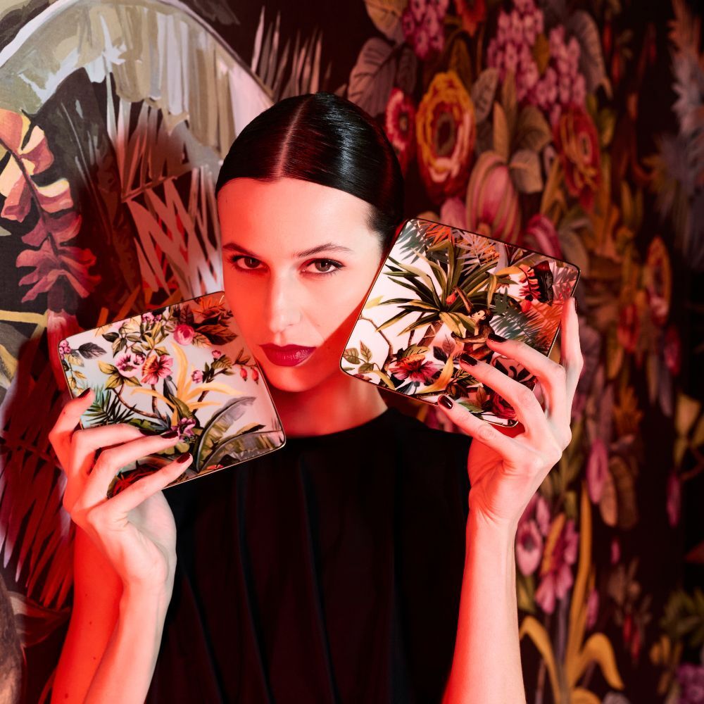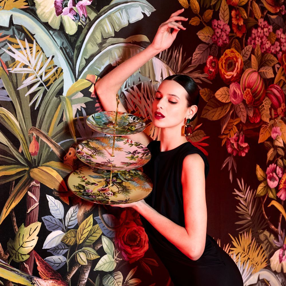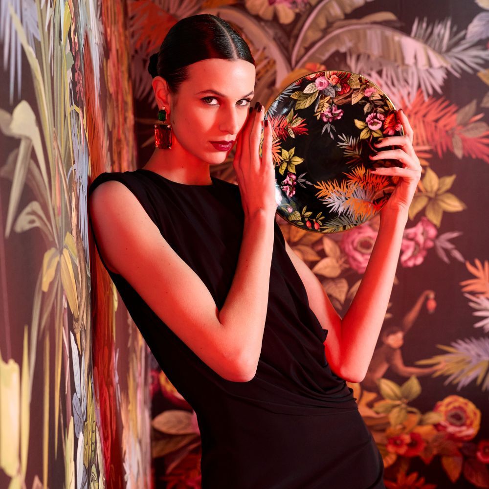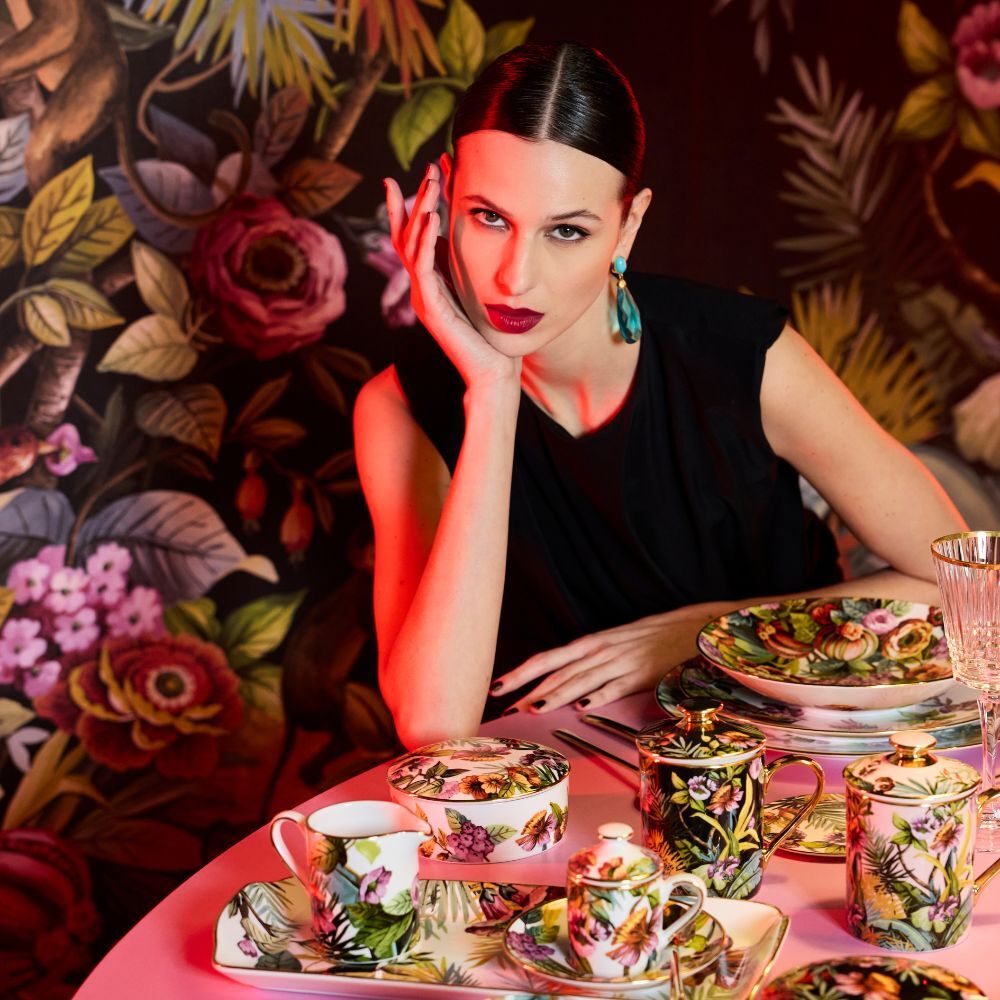 Straight from the varied creative universe of Simone Guidarelli (creative director, stylist, fashion consultant, and content creator), the Exotic Jungle porcelain tableware leads you into a pop, imaginative, and colorful jungle, among anemones and lush plants, curious monkeys, and colorful hummingbirds perched on palm trees. An overwhelming burst of joy and good humor for every occasion around the table.