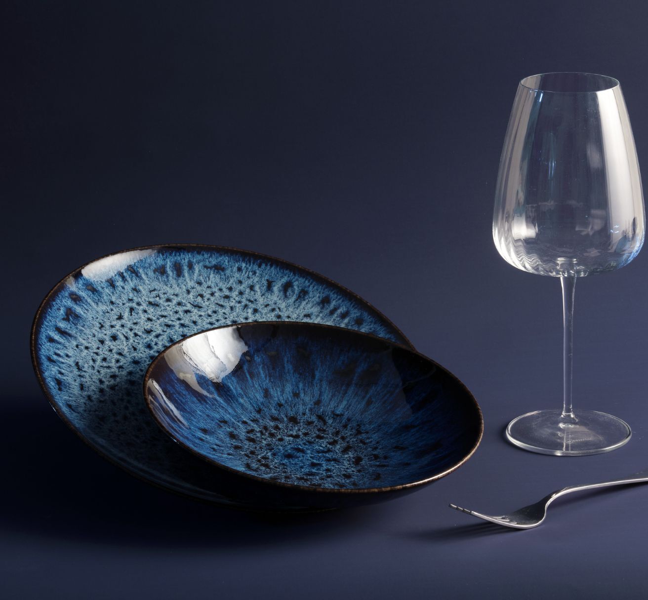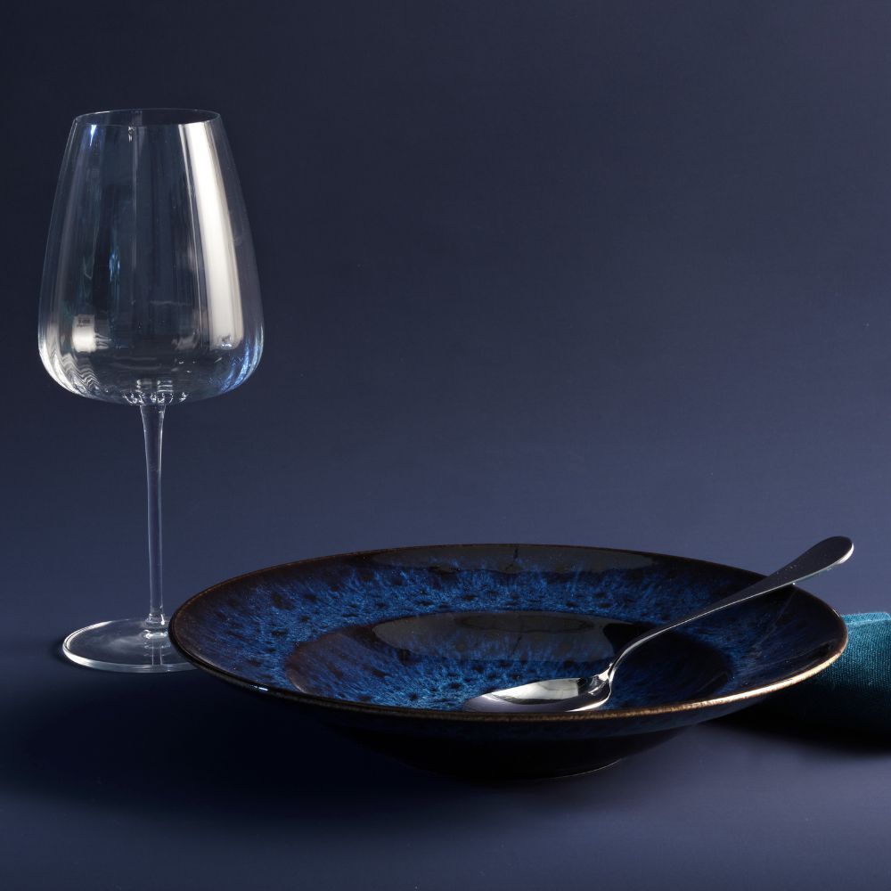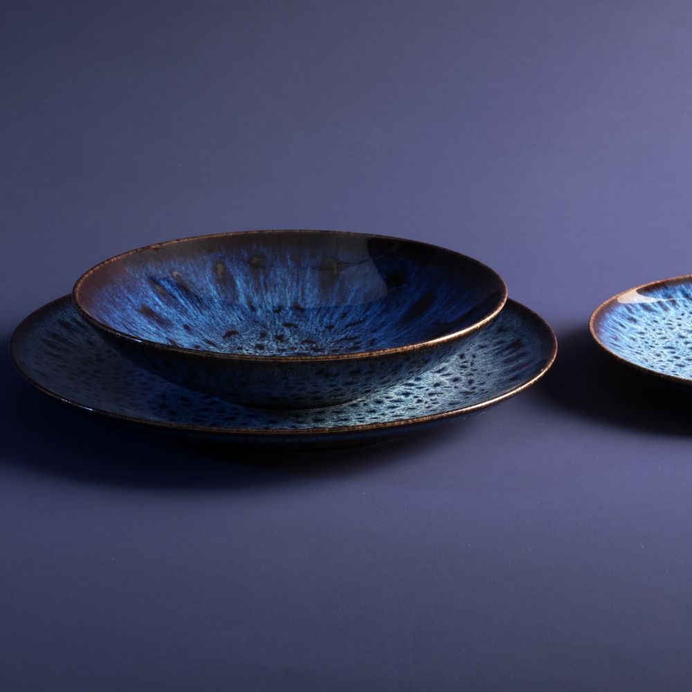 La tavola si veste di mille sfumature di blu, create dagli smalti reattivi, che vengono applicati a ogni singolo articolo rendendolo unico.