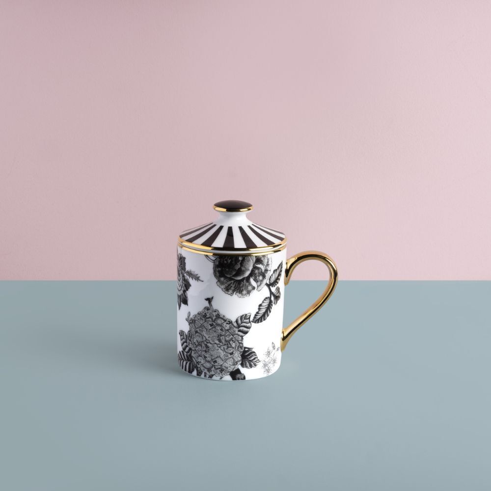 Mug in porcellana con coperchio rifinita a mano con filo in vero oro.