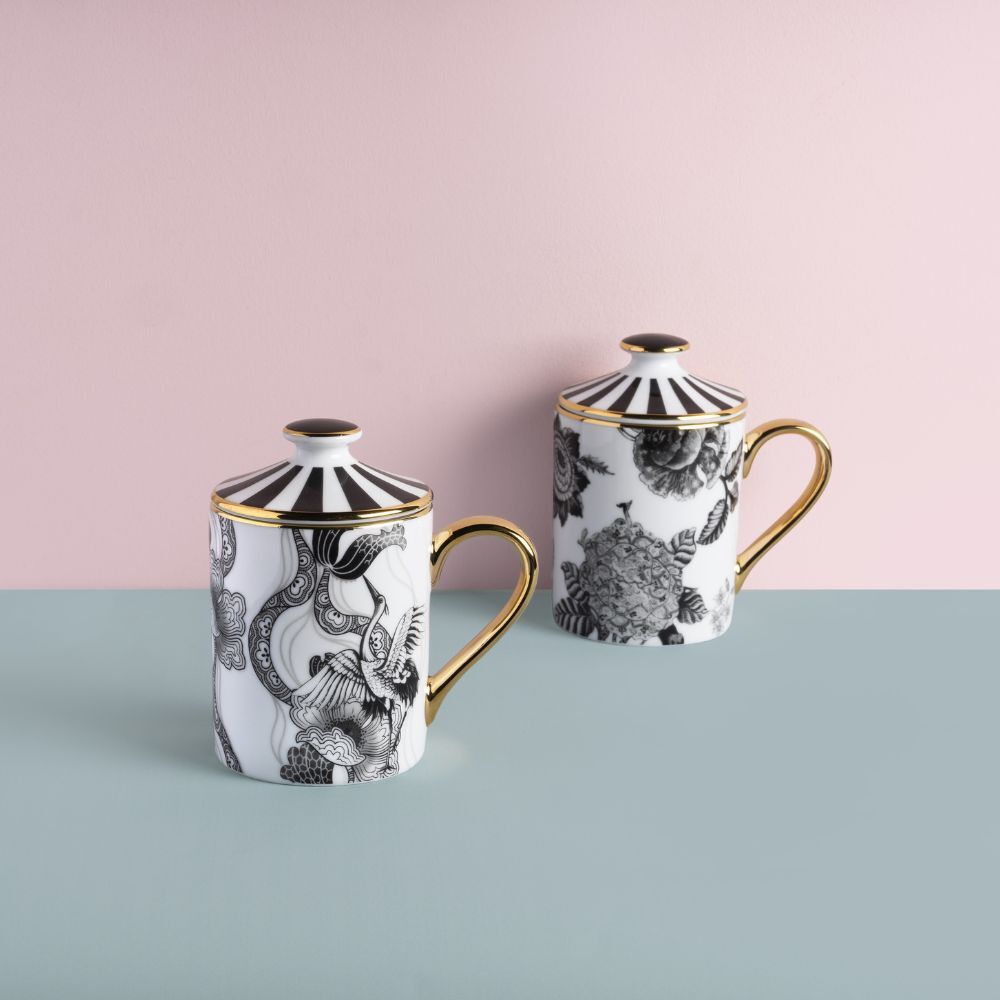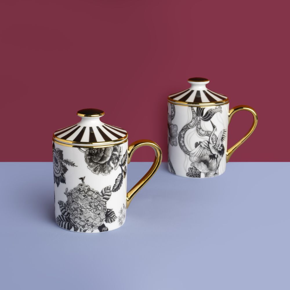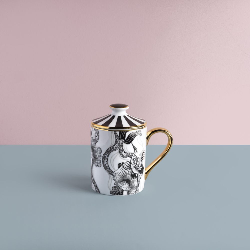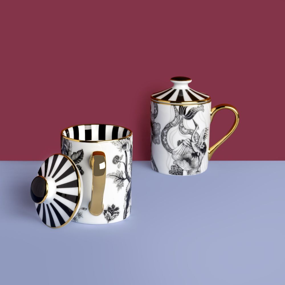 Eleganti mug con coperchio, perfette anche come idea regalo, entrano a far parte della bellissima collezione in porcellana Souvenirs de Voyage di Simone Guidarelli. Sempre con finiture in elegantissimo filo oro 24 kt applicato a mano.