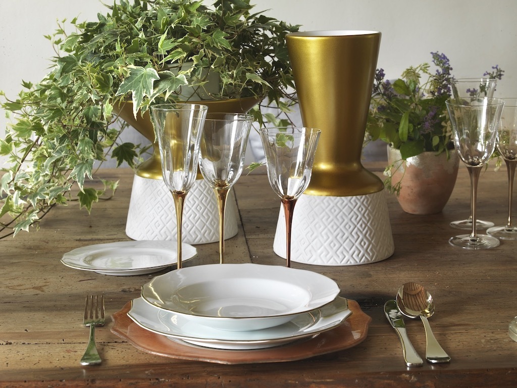 Il servizio in porcellana Elga Oro si veste di luce con le finiture in filo oro, che conferiscono eleganza e raffinatezza ai piatti.