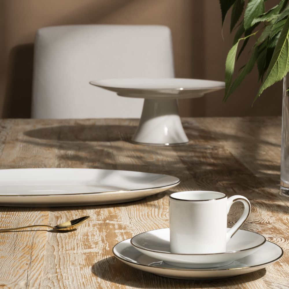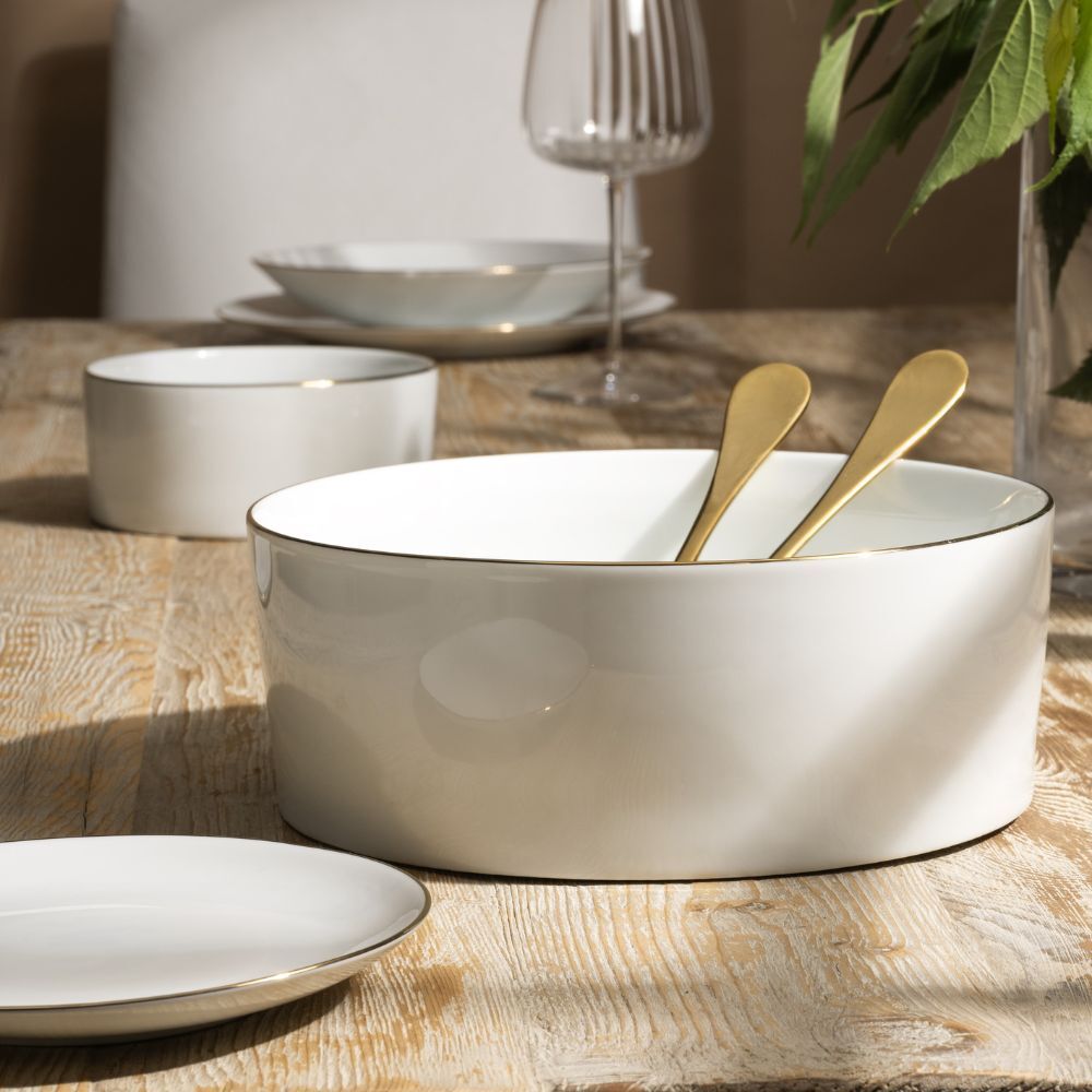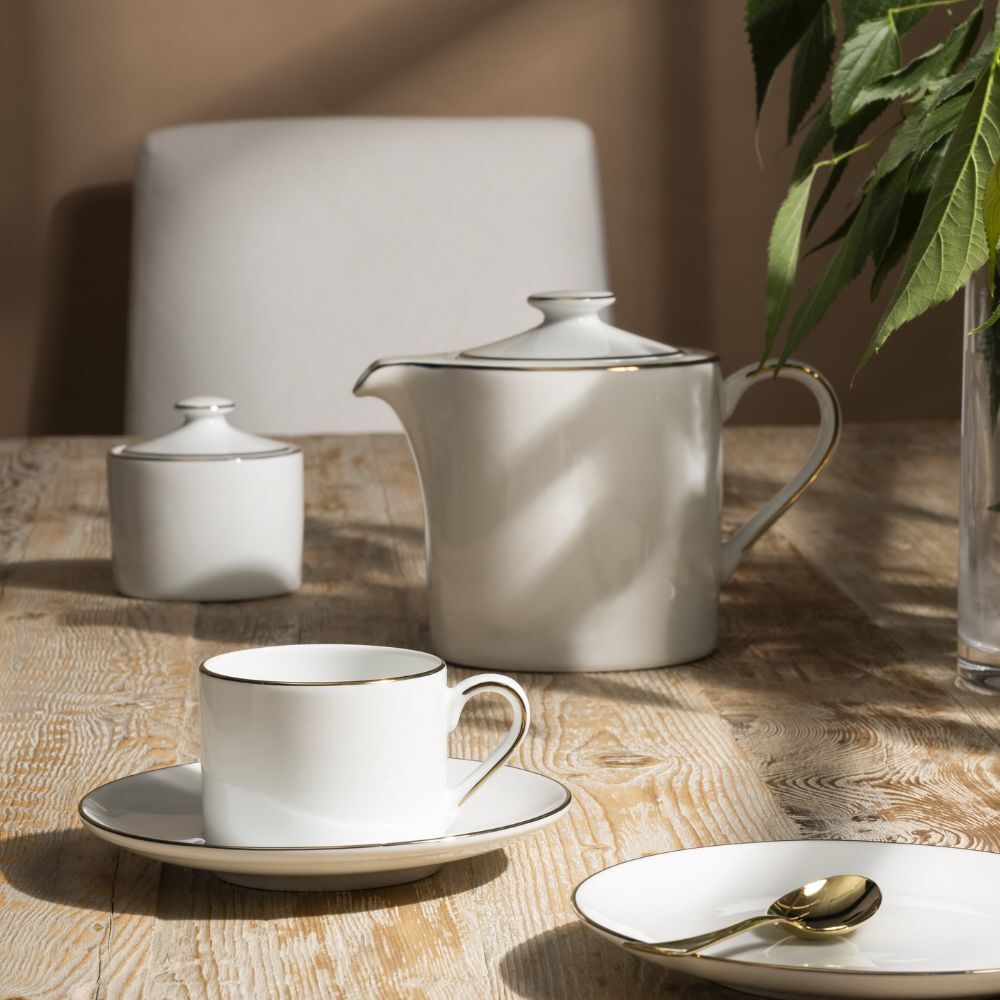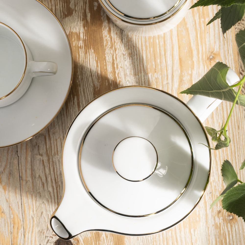 L'eleganza della porcellana bianca incontra la preziosità del filo oro, per un effetto raffinato e scintillante.