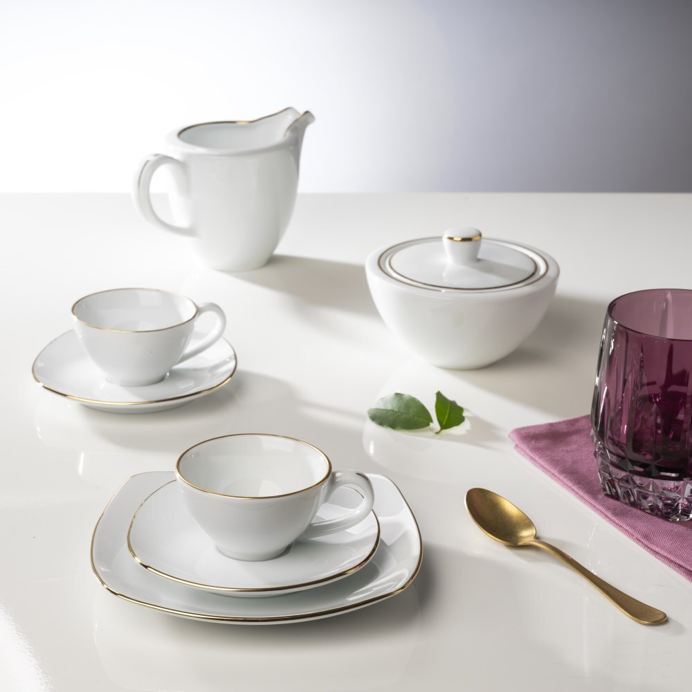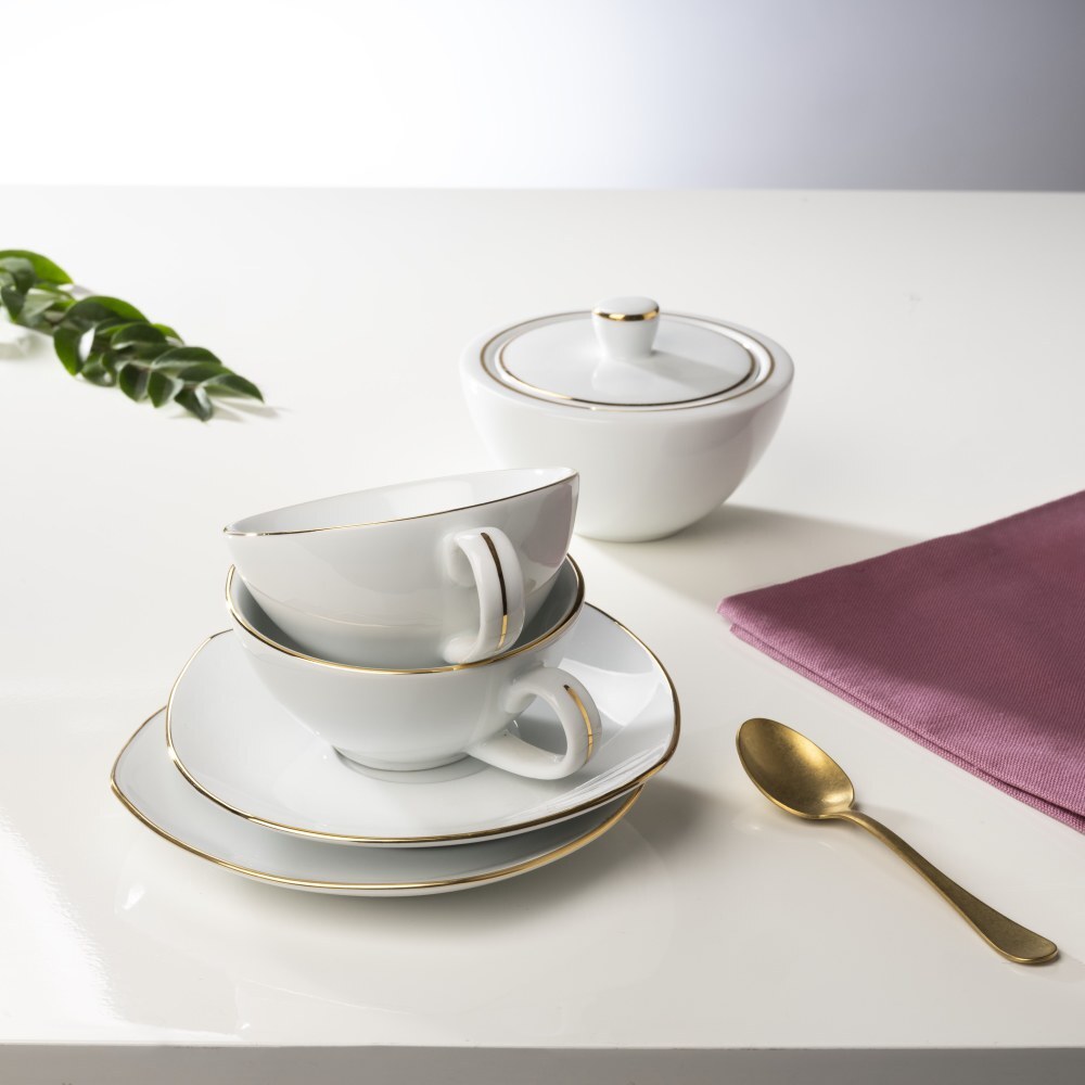 Set di 6 piattini dolce in porcellana bianca rifiniti con filo oro.