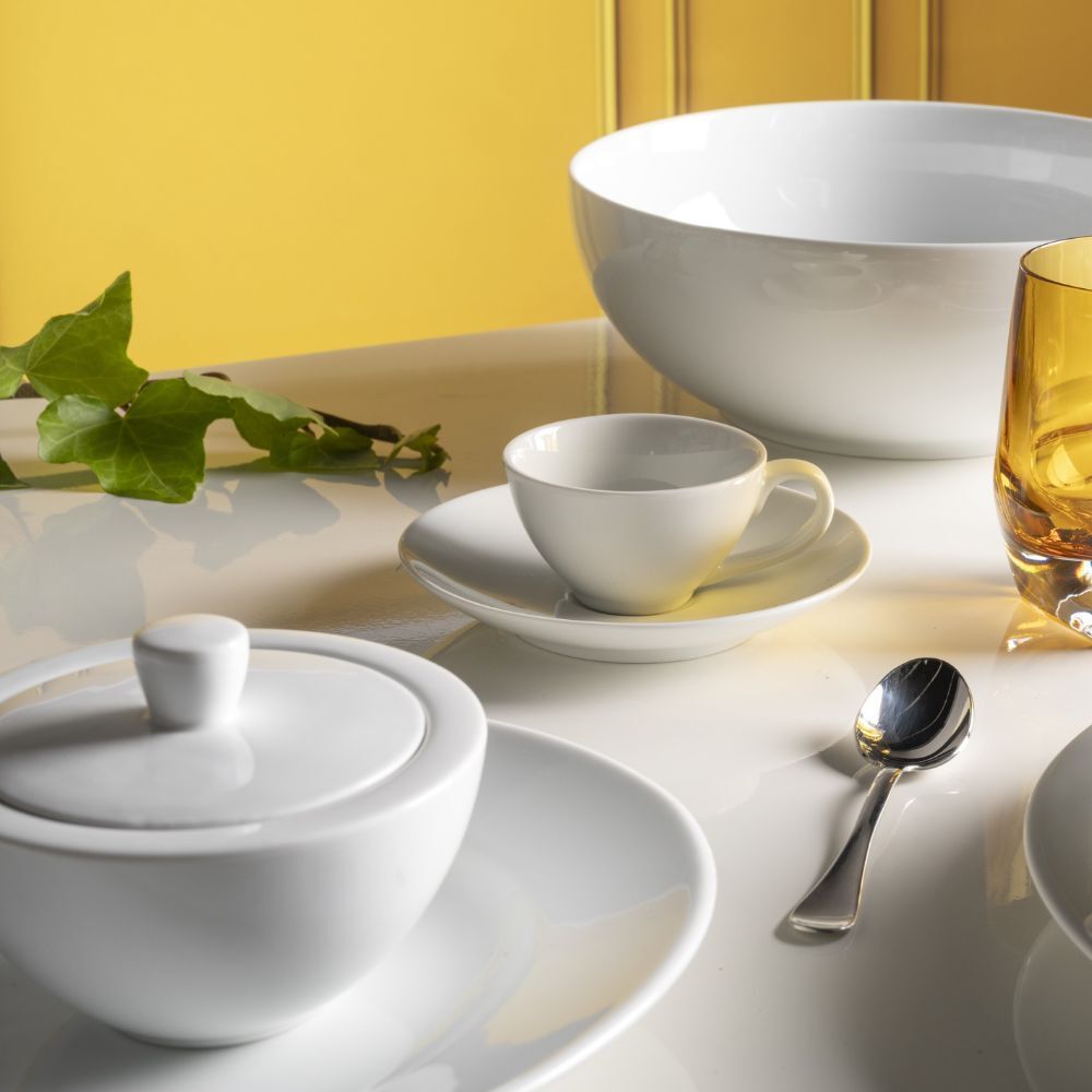 Planet Weiss, un servizio di piatti in porcellana bianca estremamente raffinato, completo anche di tazzina caffè, zuccheriera, ovale da portata e insalatiera. Per chi ama la classicità, senza mai rinunciare allo stile.