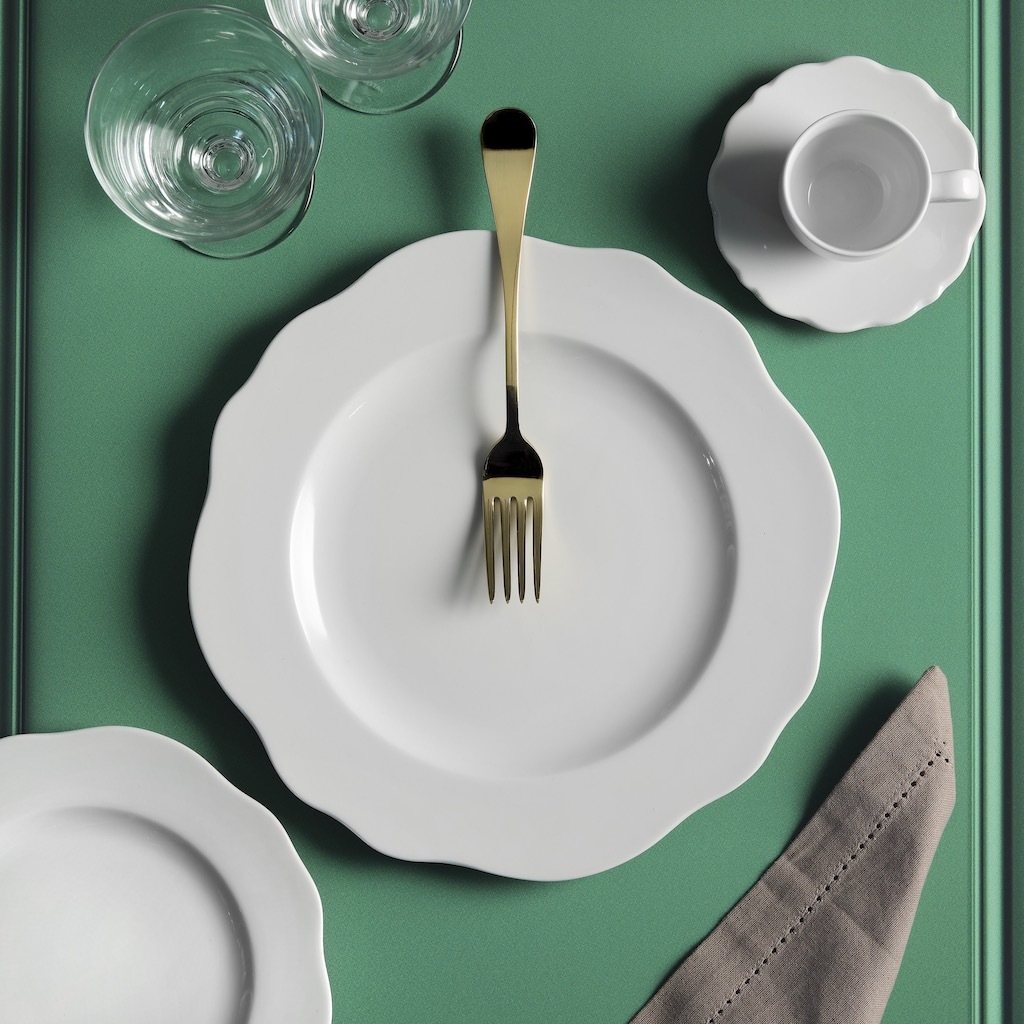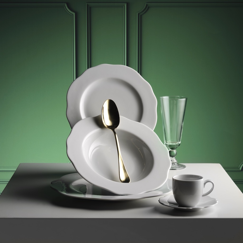 Una linea dalla forma particolare per mise en place raffinate, dall'antipasto al caffè.